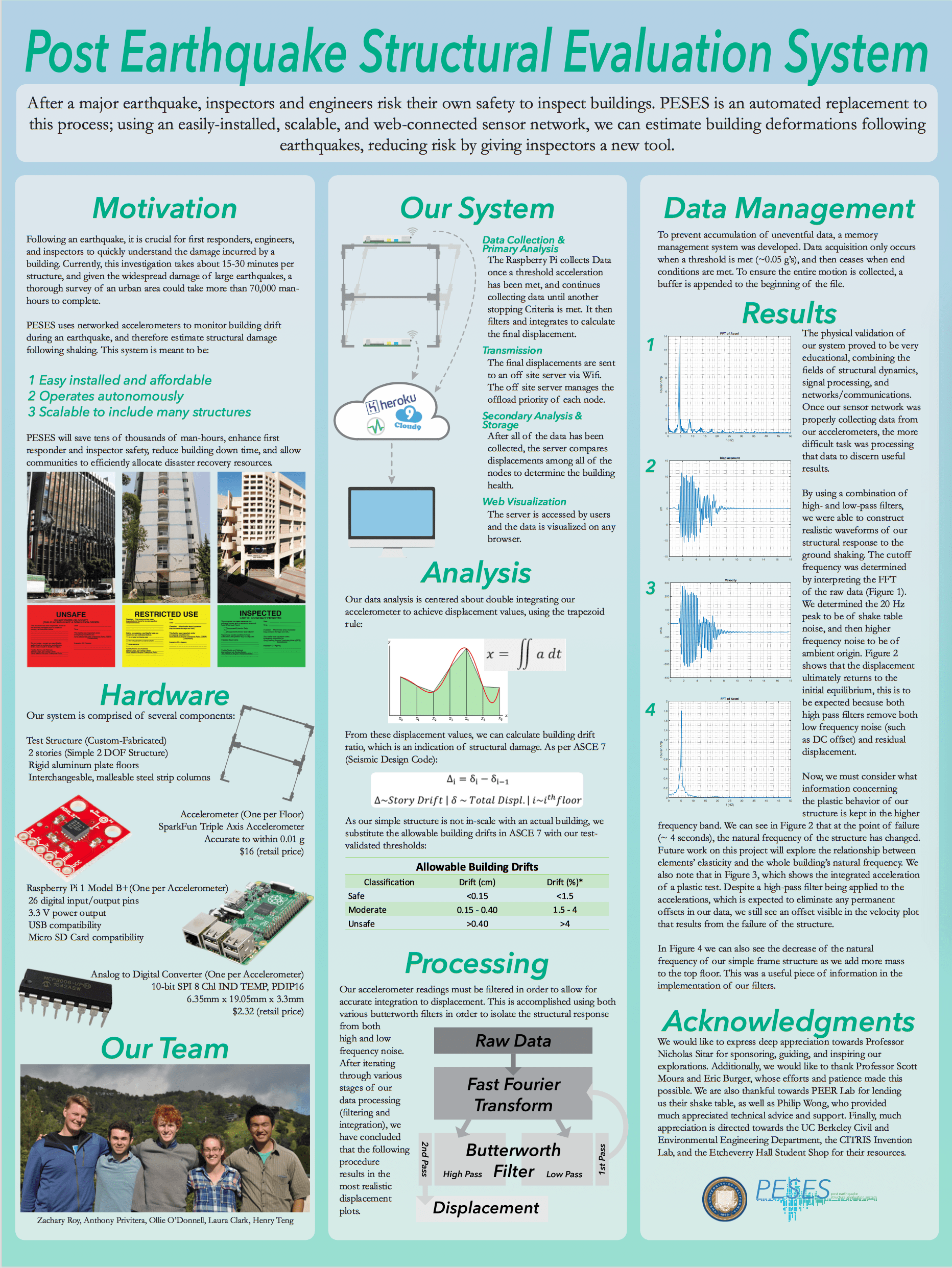 After a major earthquake, inspectors and engineers risk their own safety to inspect buildings. This semester I worked with four talented civil engineers to develop an automated replacement to this process. Using an easily-installed, scalable, and web-connected sensor network, we can estimate building deformations following earthquakes, reducing risk by giving inspectors a new tool.